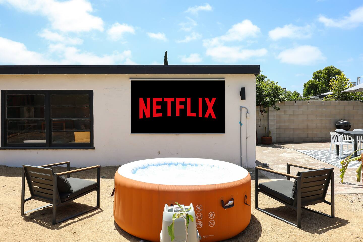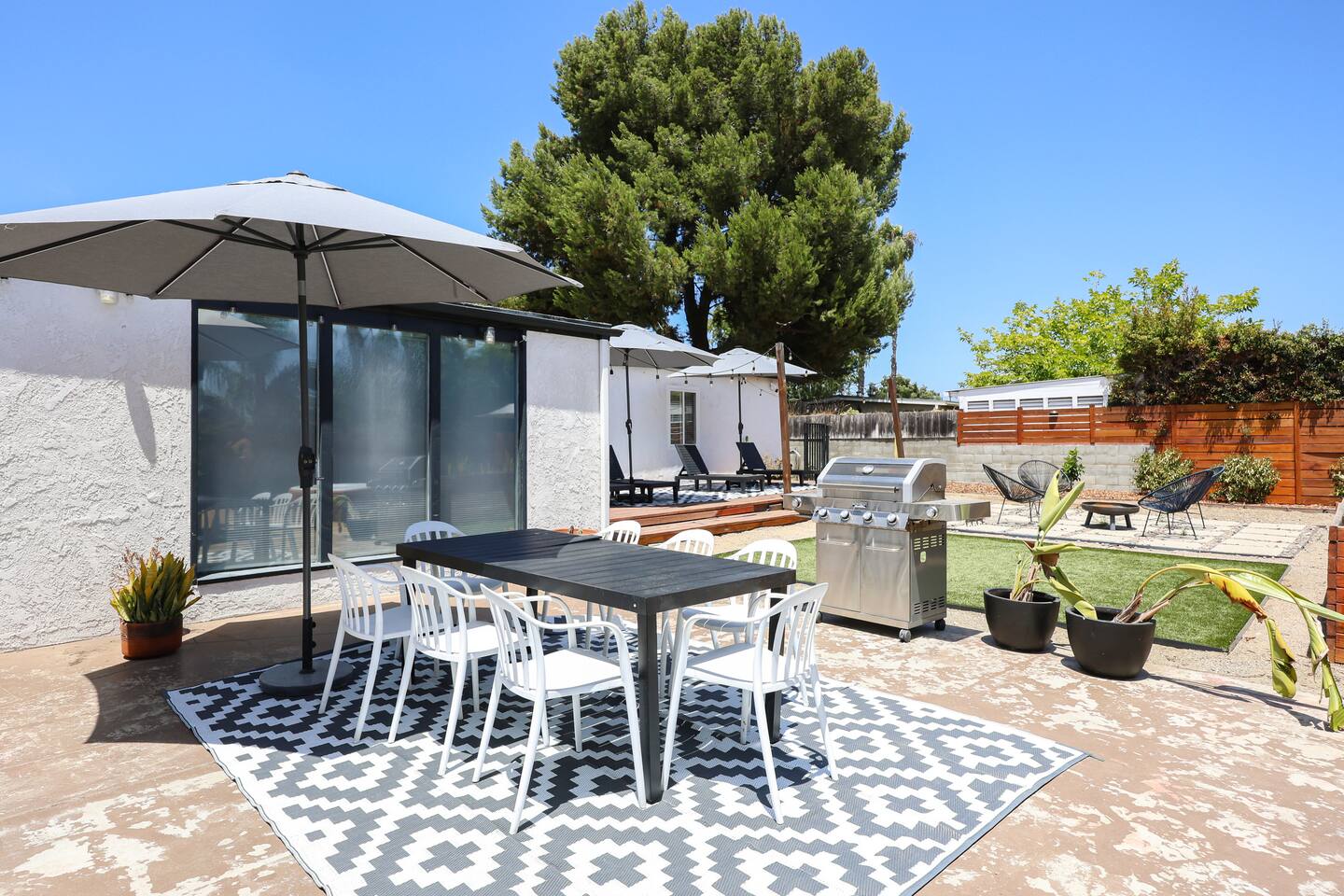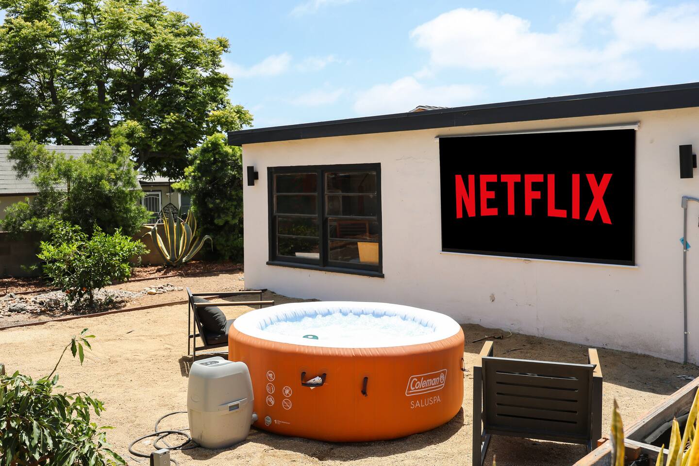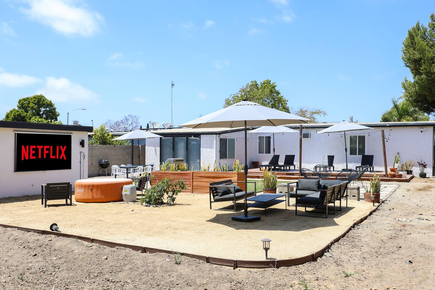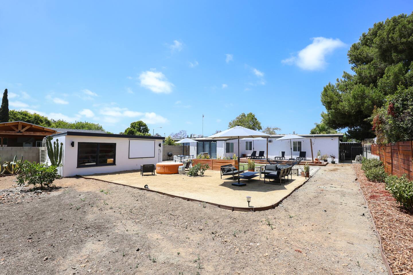 Please enjoy the new remodel with brand new luxury bathrooms including a low-profile tub perfect for bathtime routines and nightly soaks, new smart appliances including a Samsung refrigerator, high-capacity LG washer and dryer, and new drought resistant backyard landscaping to accommodate our new outdoor spa and movie watching experience. From a 65" Smart Tv to our outdoor spa, we strive to deliver an overall great experience and environment for the whole crew. The home also comes fully equipped with Netflix, HBO, Hulu, Apple TV, Paramount+ already preloaded to go, a fully enclosed private backyard for your fur babies to romp around in, four distinct outdoor seating sections with BBQ and charcoal grills, and multiple coffee modalities so there's something for everyone. Forget anything? Target and the College Grove marketplace is just a 1 mile away along with all your favorite San Diego cult classic eateries and restaurants within fast delivery distance.