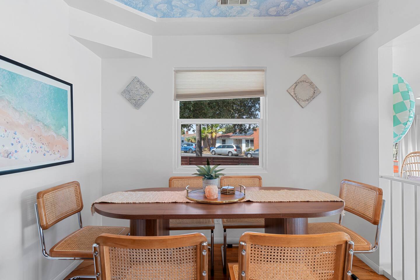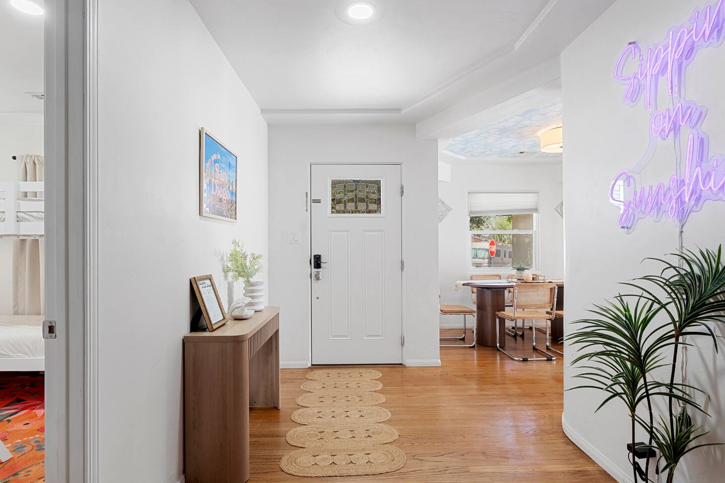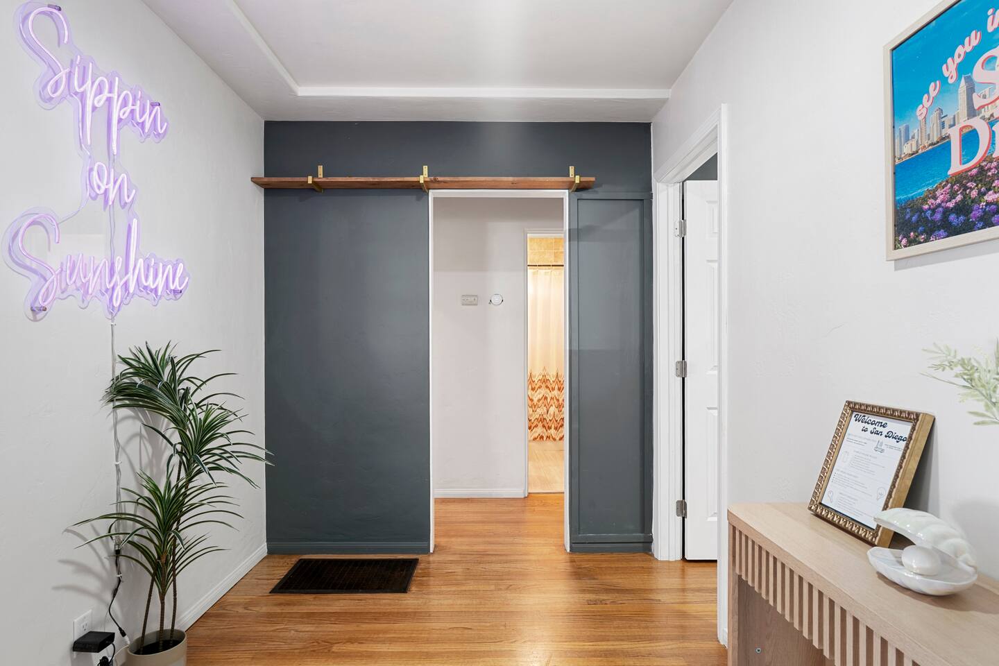 Indulge in a serene San Diego escape featuring a private spa and elegant fire pit under the stars. Nestled in a tranquil very safe neighborhood yet minutes from pristine beaches in La Jolla and Coronado, the Zoo, SeaWorld, and Marine bases. This retreat offers a spacious backyard for cornhole, ping-pong, and other entertainment. Ample parking and a chef-ready kitchen make it perfect for gatherings. Experience refined comfort and unforgettable moments with bars and restaurants within 100 yards.